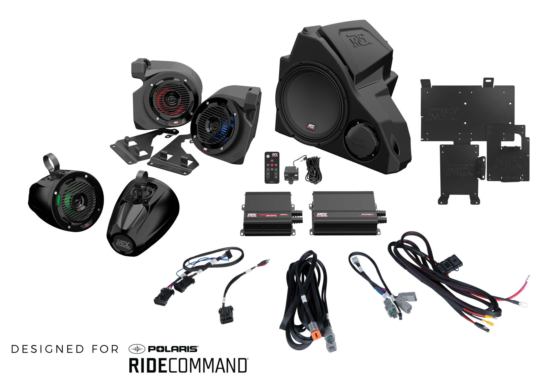 The RZR-14RC-THUNDER5 audio kit is a complete plug and play 5-speaker audio system designed for the Polaris RZR platform. This kit fits models that have installed RideCommand systems*. The package includes a set of the RZR-14-FS front speaker pods and a pair of MUD65PL speaker cans both featuring integrated RGB lighting and the RZR-14-SW subwoofer enclosure. The included MUD100.4 4-channel amplifier and a MUD600-1 monoblock amplifiers connect to the Ride Command system and provide power to all speakers via integrated harnesses that simplifies the installation, which gets you get out of the garage and back to riding quicker. *Not Compatible with Pro XP/ Pro R Model RZR’s or existing factory audio systems.