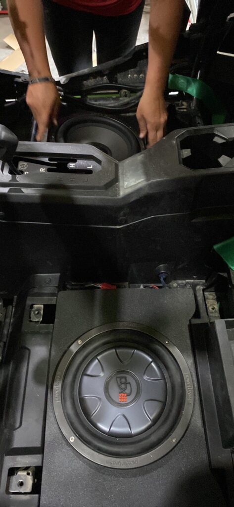 HERE WE HAVE THE LONG-AWAITED SUB PACKAGE FOR THE HONDA TALON FOUR-SEATER ITS A COMPLETE PACKAGE WITH INTERNAL AMPLIFIER POWERBASS XL-1040TD SUB SIMPLY HOOK TO POWER AND GROUND THEN REMOTE AND TO AUDIO TO SOURCE UNIT AND DONE!